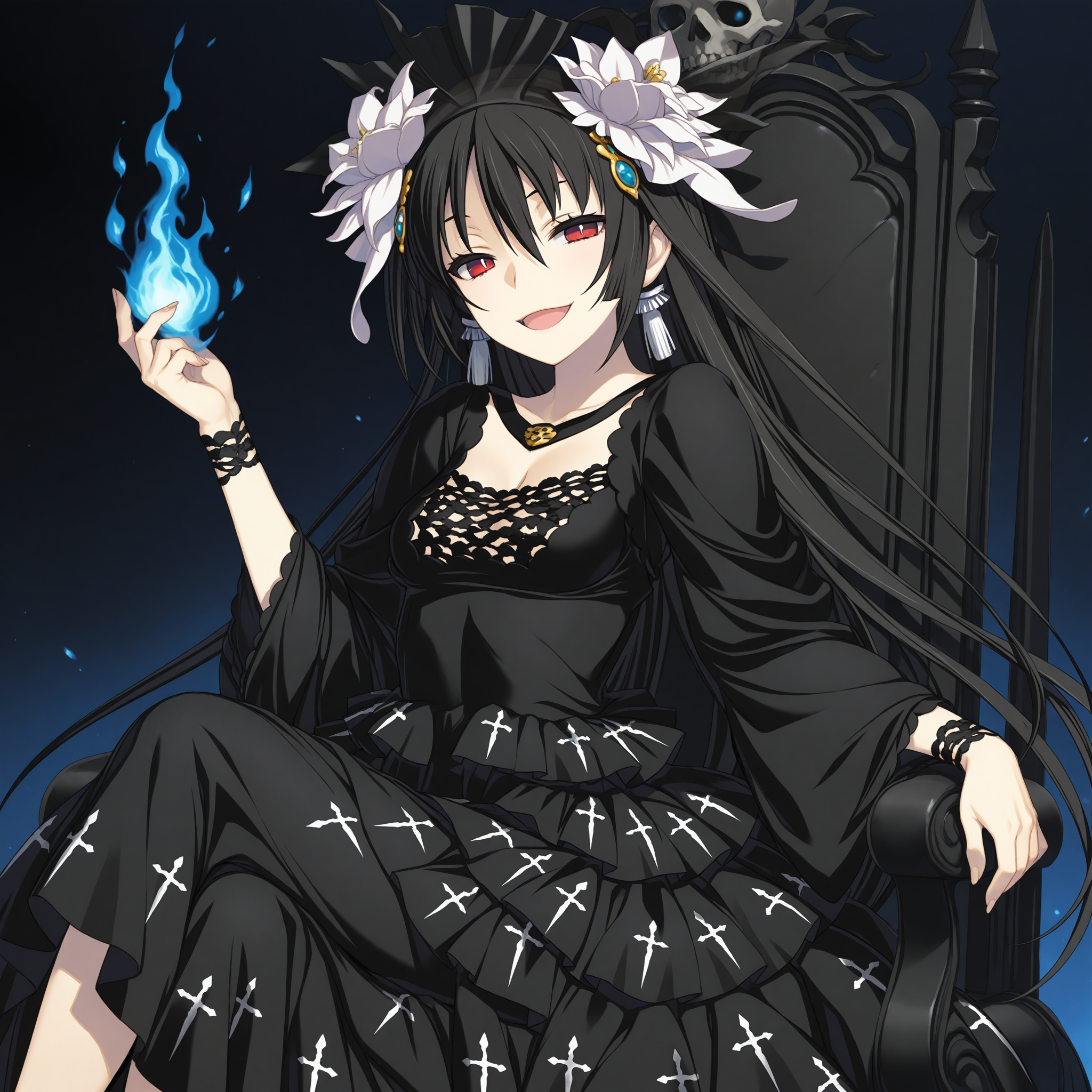 official outfit,hair flower,white flower,hair ornament,transparent headscarf,black headscarf,jewelry,black dress,layered skirt,print skirt,cross print,puffy long sleeves,wide sleeves,white tassel earrings,lace wrist cuffs,lace-trimmed dress,cleavage cutout,long skirt,