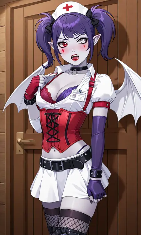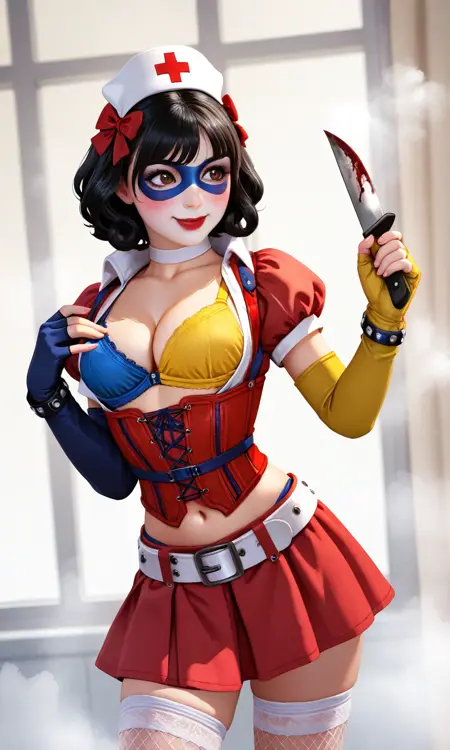 Nurse cap,purple mask,blush,white facepaint, red lips,black choker,white shirt,white sleeves, short puffy sleeves,cleavage,red bra,purple bra,red corset,navel,black belt,miniskirt,white skirt,asymmetrical gloves,fingerless gloves,red gloves,purple gloves,elbow gloves, studded bracelet, black thighhighs, fishnet thighhighs