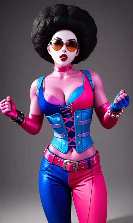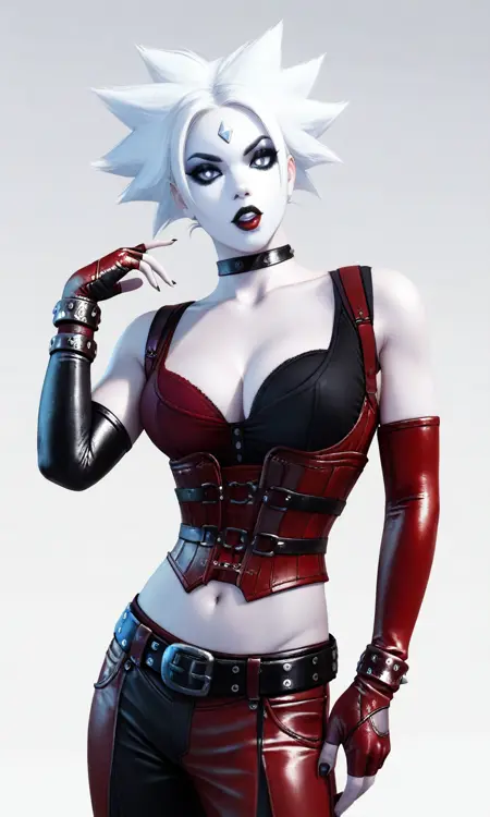 White facepaint, red lips, eyeliner, black choker, cleavage, red bra, black bra, red corset, asymmetrical gloves, red gloves, black gloves, studded bracelet, fingerless gloves, black belt, navel, red pants, black pants, elbow gloves
