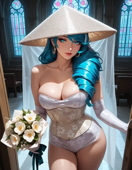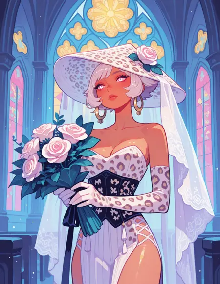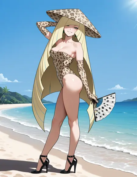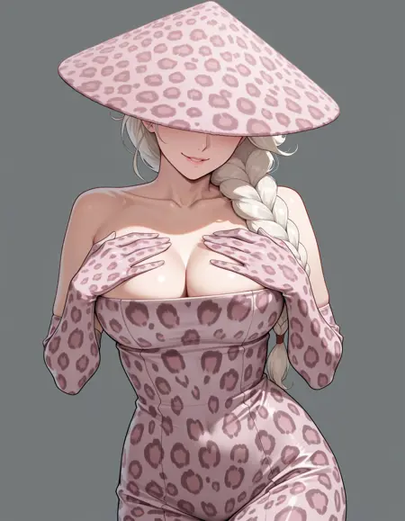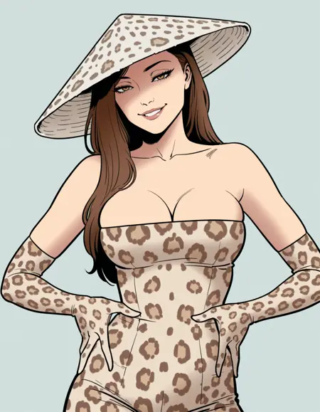 leopard print elbow gloves, leopard print clothing, underwear, leopard print corset, rigid corset, strapless, square corset neckline, collarbone, bare thighs, (leopard print rice hat, wide rice hat), hoop earrings
