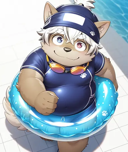 1. hmashb, dog_boy, 스트라이프 머리, 탑노트, 이색 머리카락, 흰 머리카락, 통통함, aged_down:0.5, 털이 많음, 1소년, 혼자서,