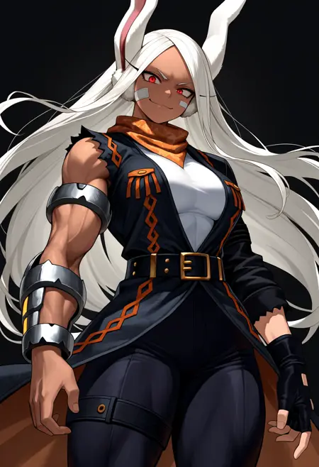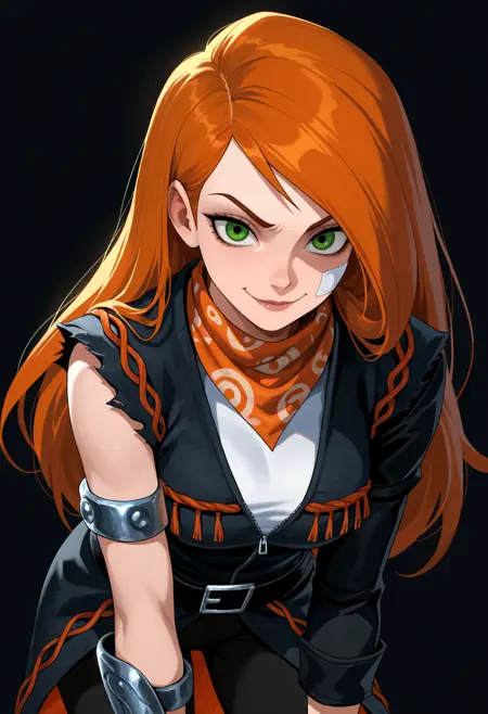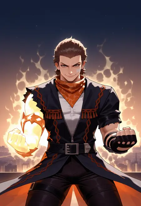 衣装タグ: 不対称な服、片袖、ノースリーブ、片腕甲、腕輪、白いシャツ、黒いコート、オレンジのトリム、オレンジのバンダナ、首にバンダナ、片手の指なし手袋、黒い手袋、黒いベルト、黒いズボン、黒いブーツ