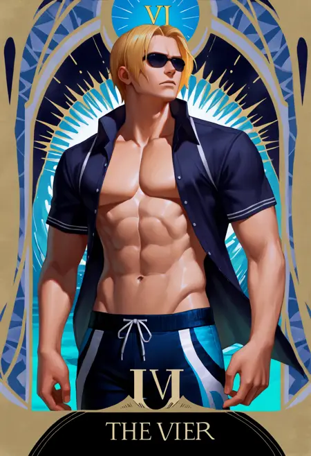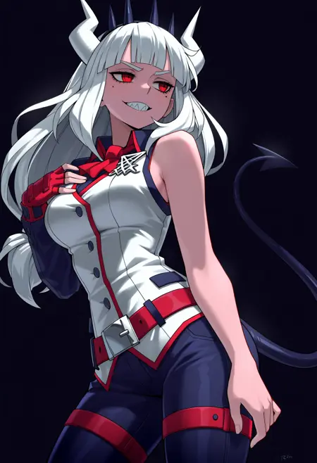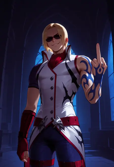 Clothes Tags: sunglasses, asymmetrical clothes, red ascot, single sleeve, sleeveless, white tunic, black trim, grey buttons, single fingerless glove, red glove, red belt, blue pants, red thigh strap, red boots