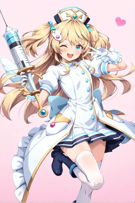 cyan eyes, blonde hair, long hair, twintails, hair ornaments, nurse hat, flat chest, white dress, medium sleeves, white gloves, blue pleated skirt, white thighhigh, blue boots