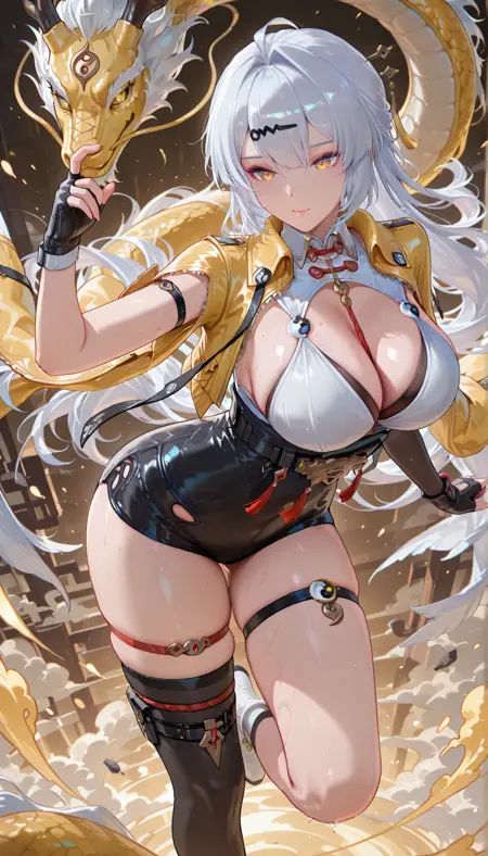 1girl, yixuan, snake hair clip, white hair, long hair, yellow eyes, yin yang rivet, large breasts, red strap between breasts,