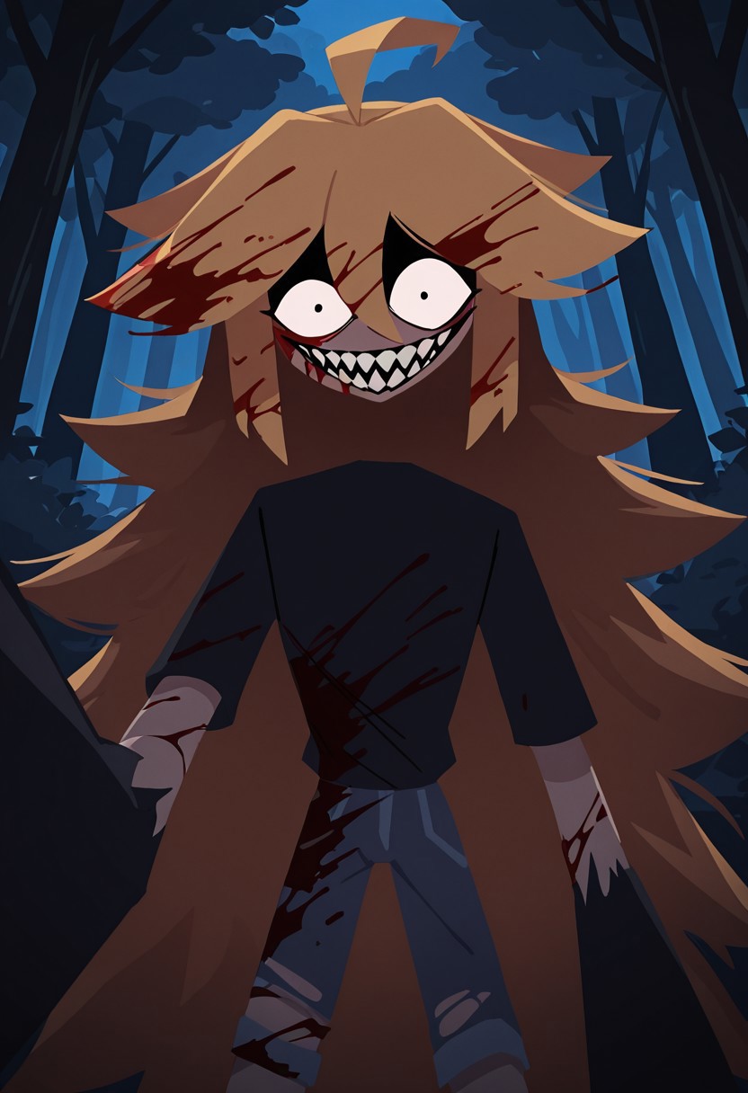 TAGS TO USE: ( flat colours, FENDanFor, 1girl, solo, torn clothes, hair between eyes, blonde hair, sharp teeth, big smile, black shirt, blue shorts, ) Trained for blonde and orange hair. There is also: no mouth, blood splatter, spike wings,