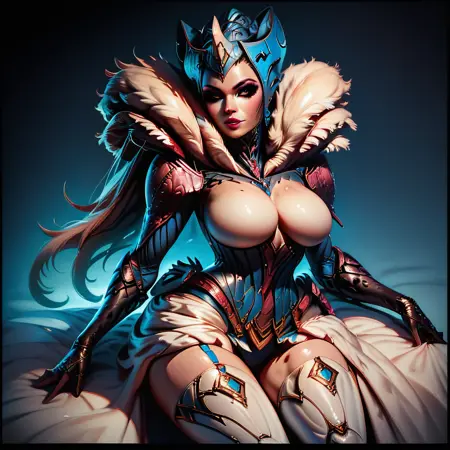 Recomend promt: sexy_female_cyborg, flexible, long_hair_with_sidelocks, detailed_female_face, armor, white_thighhigh_boots, fur_trim, elegance, white_breasts, blue_scaly_body, room, fishnet, fit, cinematic, score_9, score_8_up