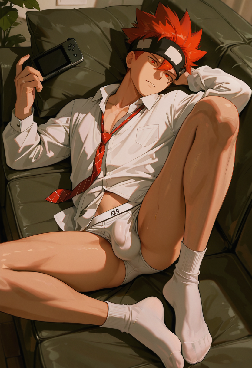 Suggested Character Tags: 1boy, male focus, solo, red hair, red eyes, spiked hair, facial tattoo, headband, black cloak, white collared shirt, pants, necktie