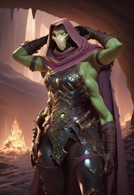 EnvySDXL,兜帽,白色面具,绿色眼睛,兜帽,斗篷,盔甲,身体护甲,四只手臂,绿色皮肤,手套,靴子