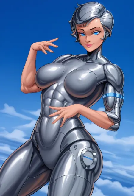 SteelheartSH, 1个女孩, 单人, 肌肉女性, 曲线身材, 机械生化人, 银色盔甲, 闪亮盔甲, 短发, 银发, 剃边发型, 金属质感头发, 蓝眼睛, 粉色嘴唇, 大胸部, 大臀部, 厚大腿, 紧身银色盔甲, 金属未来感连体衣, 闪亮服装, 肌肉腿部, 肌肉手臂, 腹肌,