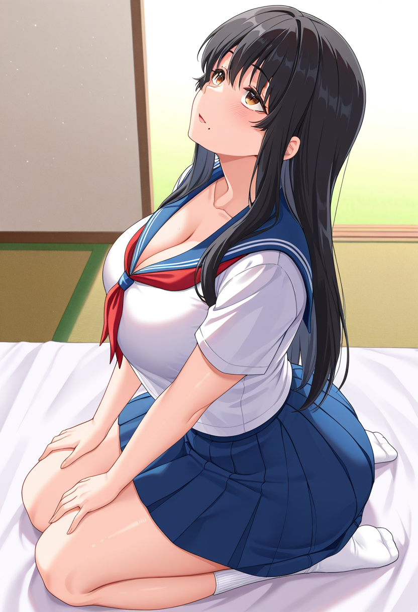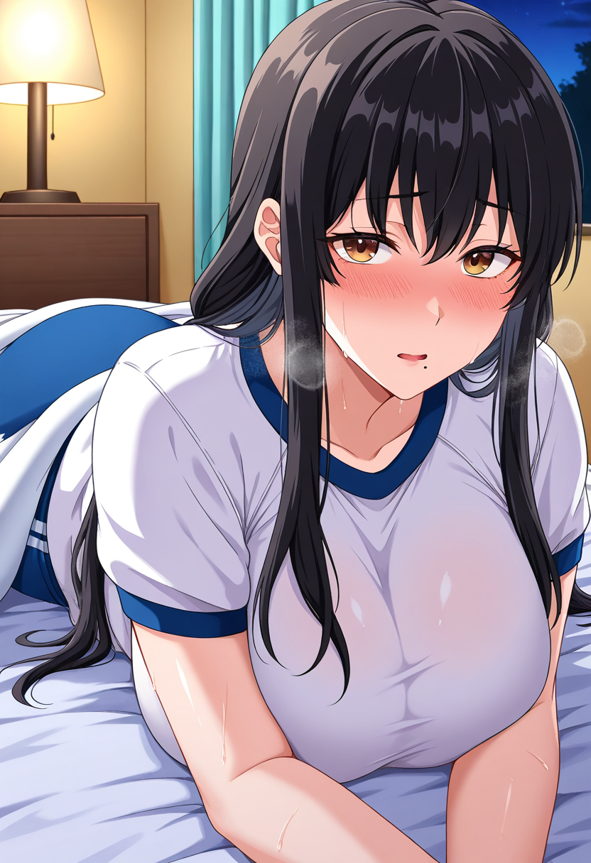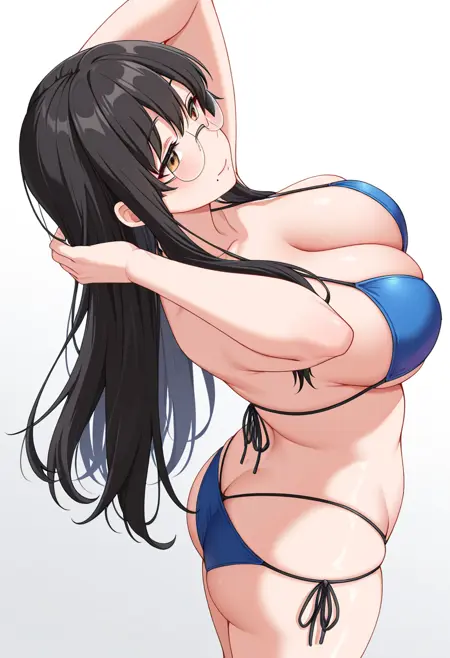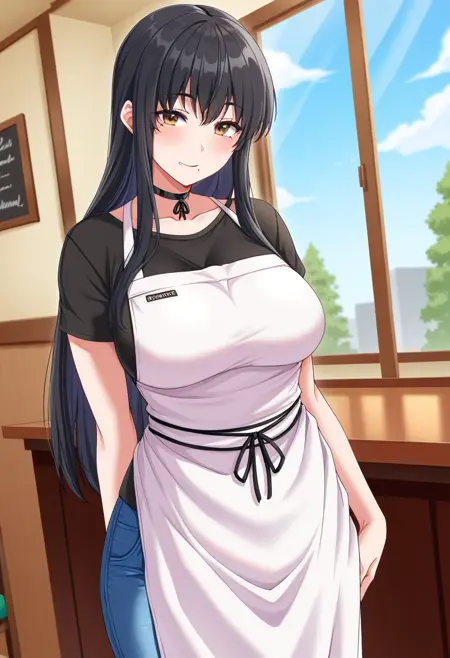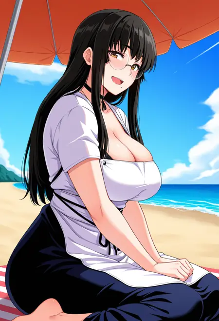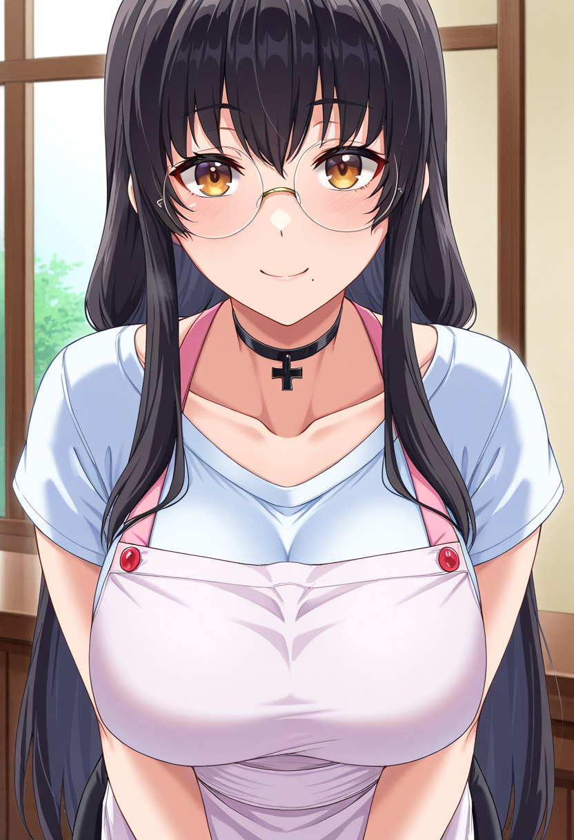 - risaww, mature female, black hair, brown eyes, long hair, sidelocks, mole under mouth, large breasts,