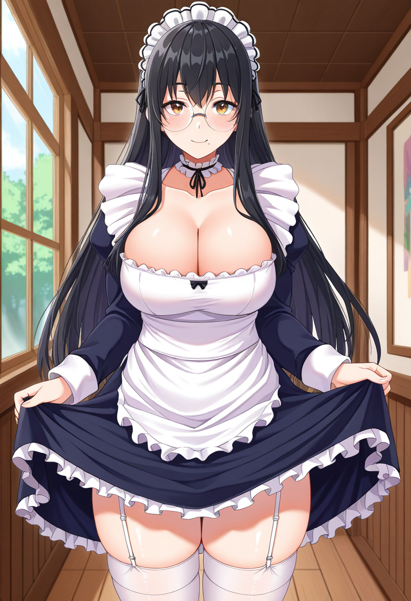 - maid, maid headdress, frilled choker, breasts, cleavage, frilled dress, long sleeves, maid apron, thighhighs, garter straps,