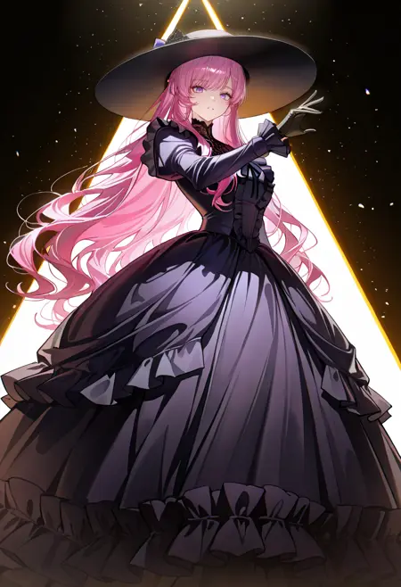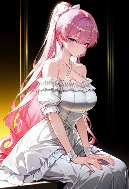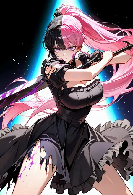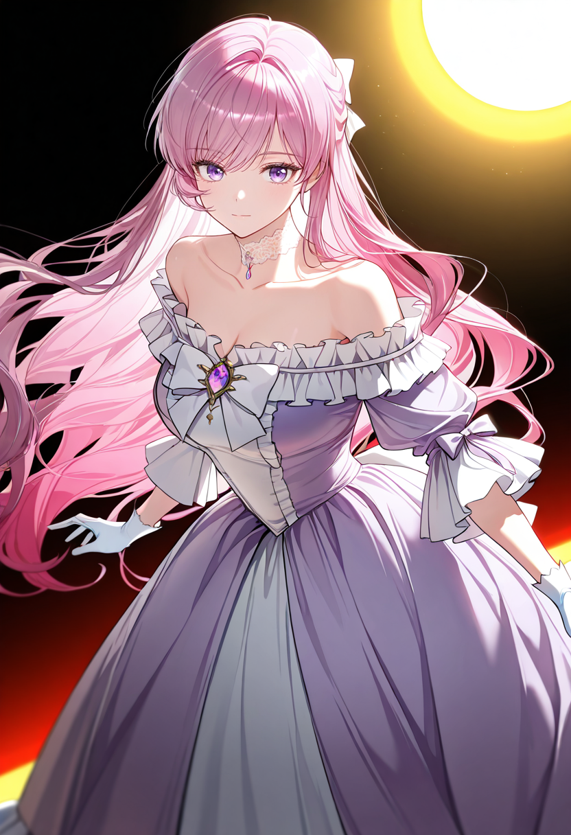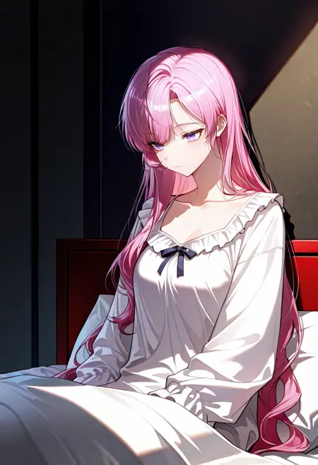 echinacea, pink hair, long hair, bangs, purple eyes, shiny hair