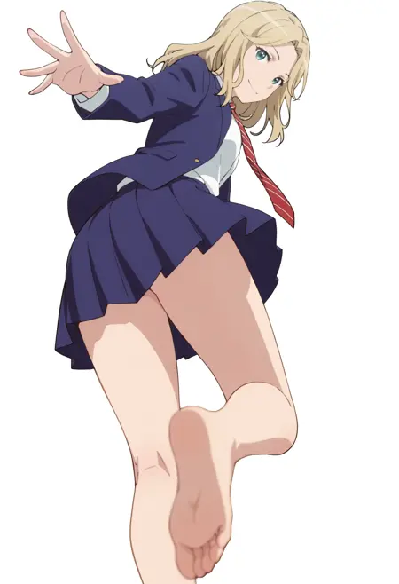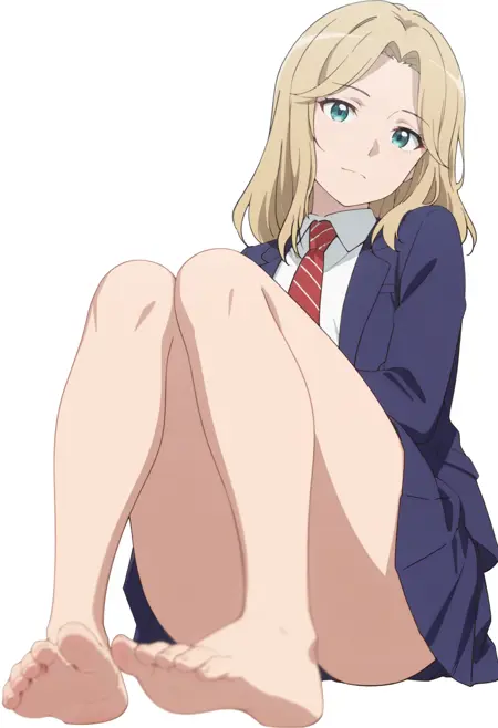 校服, 蓝色夹克, 开襟夹克, 白色衬衫, 斜条纹领带, 红色领带, 百褶裙, 蓝色裙子, 蓝色袜子, 乐福鞋
