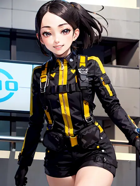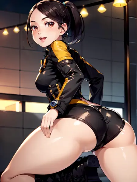 プロンプト: 黒い手袋、腕時計、黒い目、ショートパンツ、黒いショートパンツ、ブーツ、手袋、ポニーテール、ジャケット、ショートパンツ、黒髪、長髪
