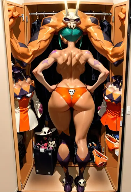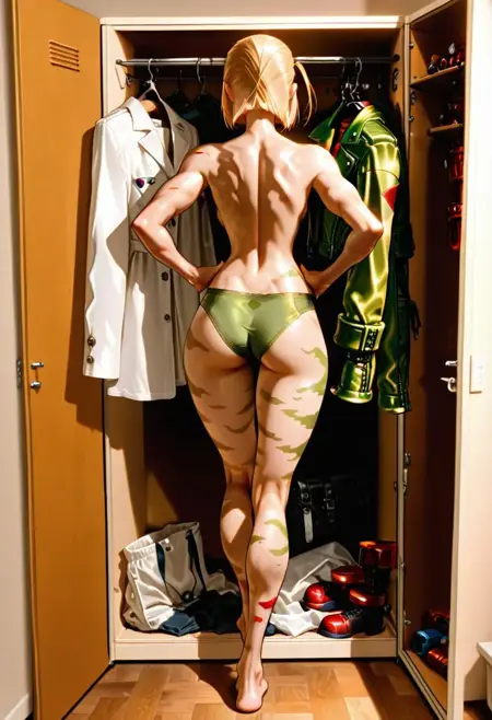 Closet, open closet, wardrobe, open wardrobe, hands on hips, facing open closet, only panties