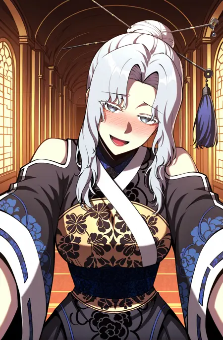 | 학습된 단어 | 1girl, solo, silver hair, long hair, hair bun, hair loop, sidebangs, loose strands, hair ornament, hair stick, hair tassel, side hair strands, middle parted bangs, wavy side locks, 복사됨! obsidian_flower, black kimono, high collar, floral pattern, golden embroidery, shoulder cutout, wide sleeves, white sleeve trim, blue waist sash, layered skirt, inner layer pattern, blue floral accents복사됨! |