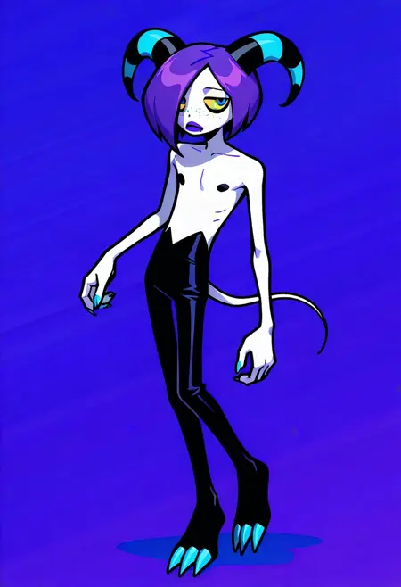 Zor, 1boy, sinister and elegant design, pale white skin, sleek pants, teal claws, sharp black horns with striped teal accents, vibrant purple hair styled in a dramatic side part, blue eyes, yellow sclera, freckles on face