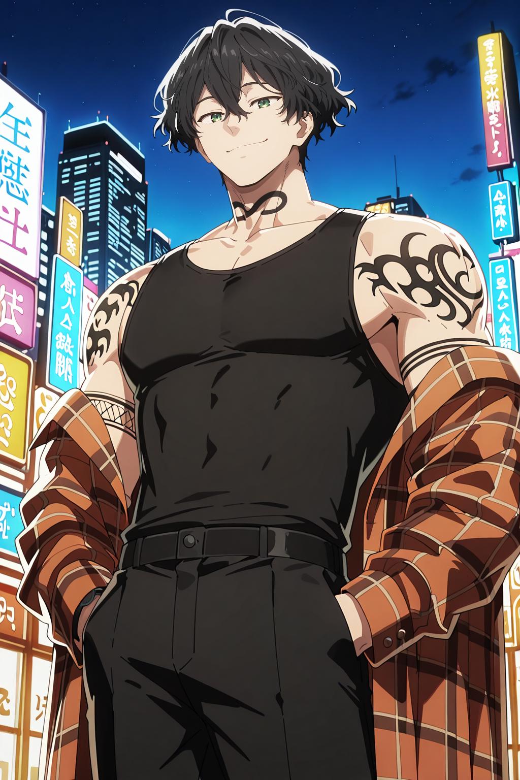 endo, endo_yamato, 黑发, 绿眼, 发丝遮眼, 波浪发, 纹身