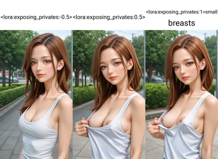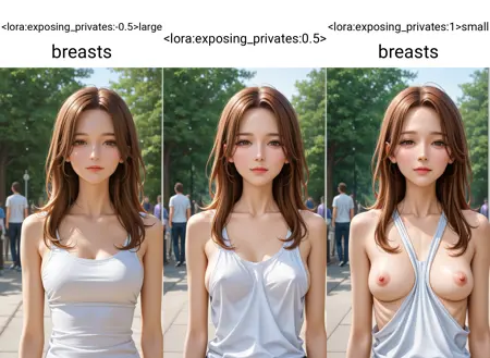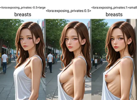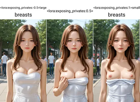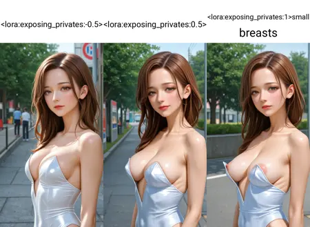 これはヌードスライダーではありません。このLoRAは服を動かしたり、修正したりして、彼女のプライベート部分をより多く/少なく見せますが、服を脱がせません。
