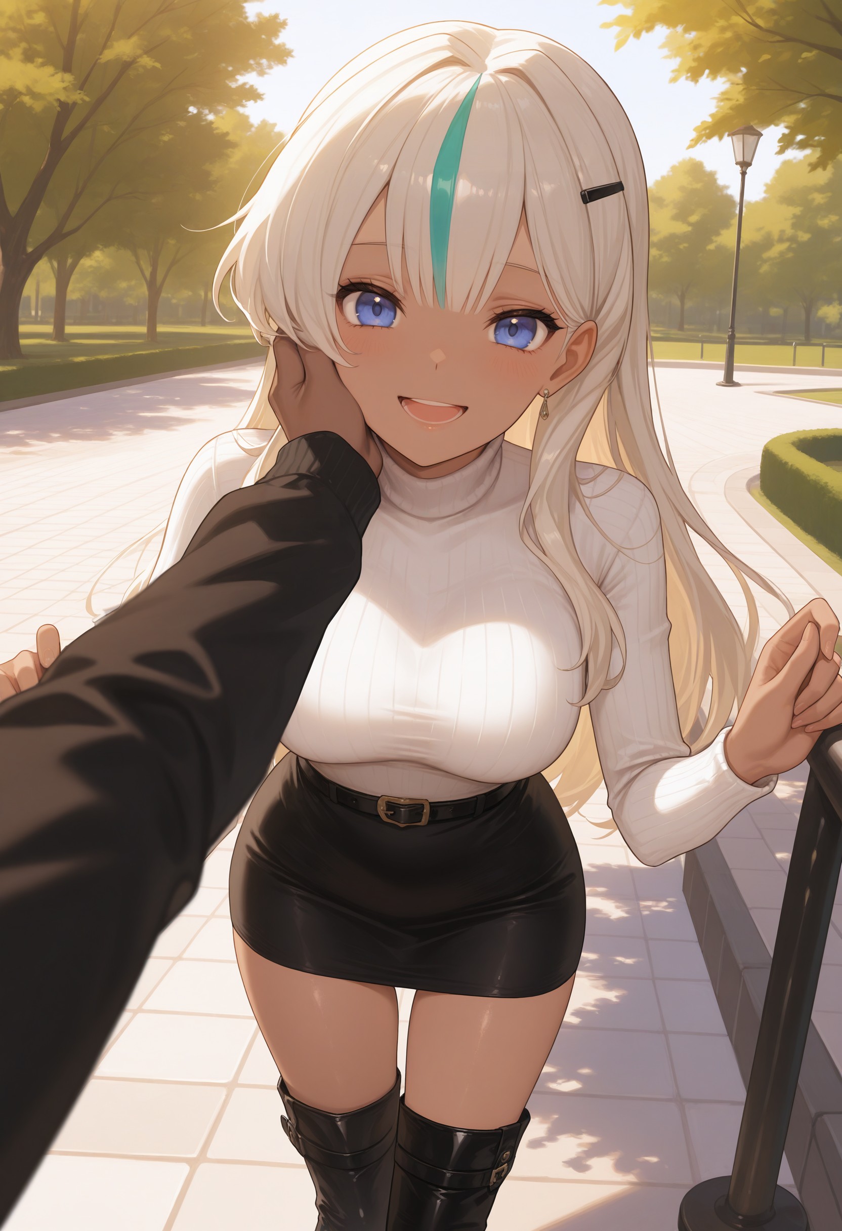 Trigger words for office: dark skin, platinum blonde hair, aqua hair, streaked hair, long hair, hair ornament, hairclip, blue eyes, white sweater, ribbed sweater, turtleneck sweater, black belt, black pencil skirt, thigh boots,