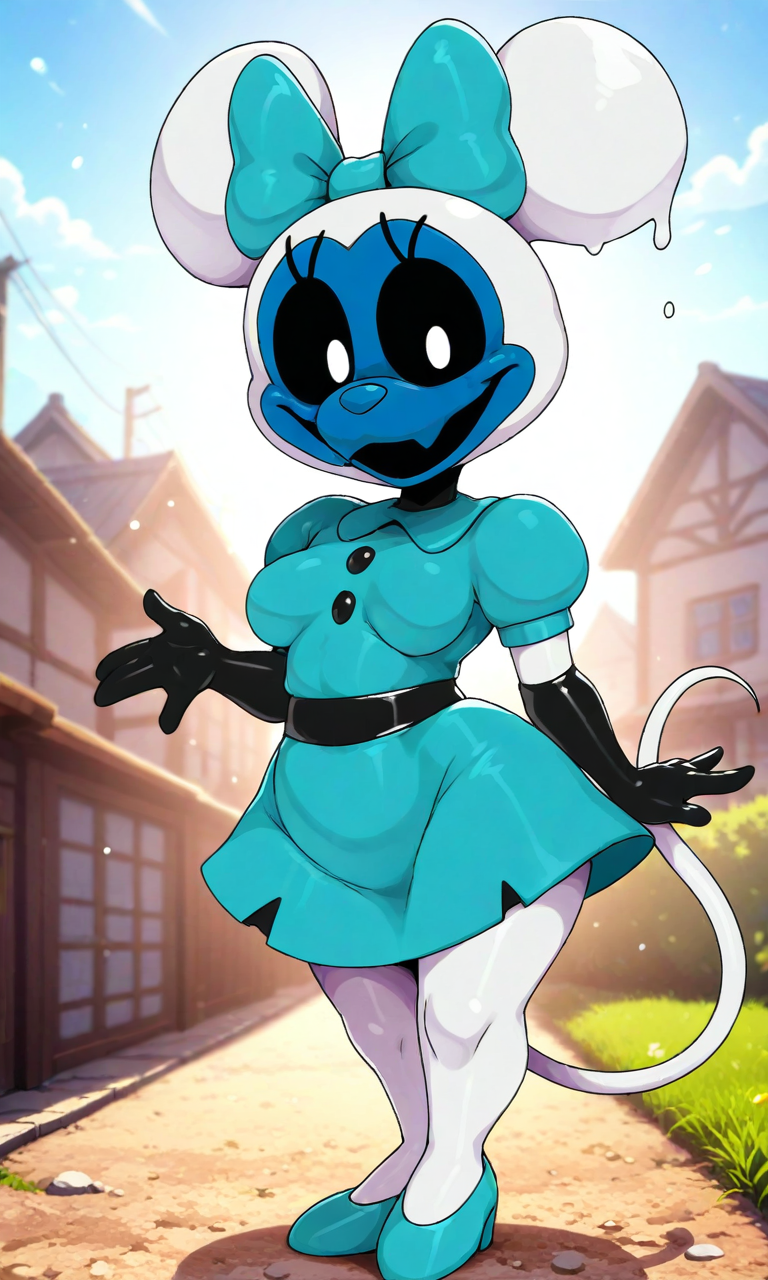Tags: pnminni3, white body, blue face, blue muzzle, black gloves, aqua dress, black polka dots dress, aqua bow on the head, aqua heels, white mouse tail, melting, wide eye sockets, small eye balls