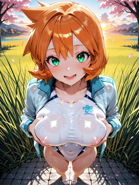 프롬프트: 1girl, tsurime, side ponytail, orange hair, short hair, blue eyes, bangs, eyelashes, realistic