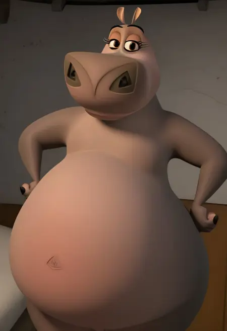 gloria, hippo, female, 3D, fat, eyelashes, big snout, gray skin,