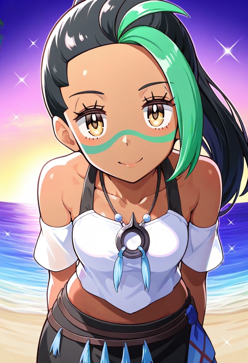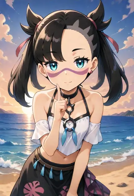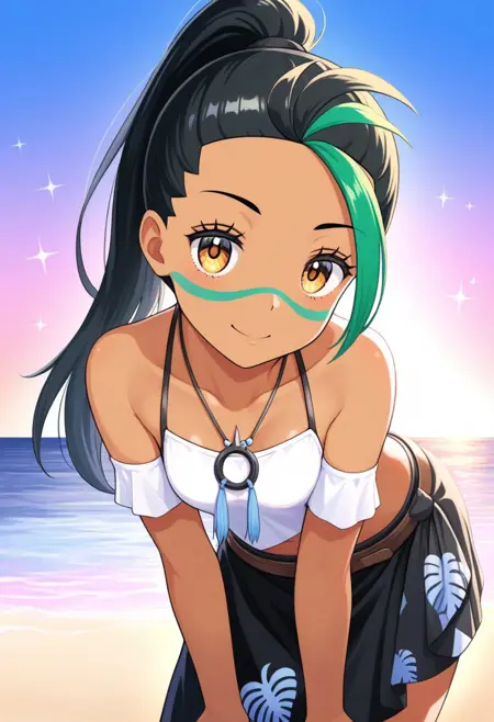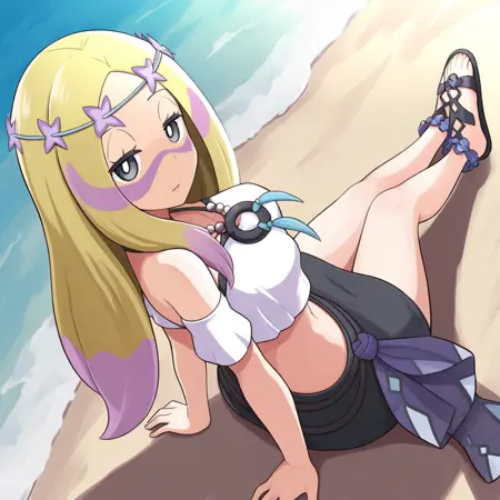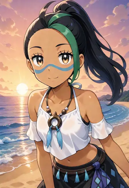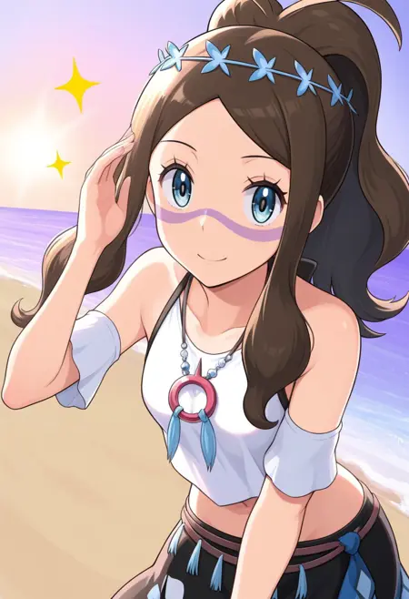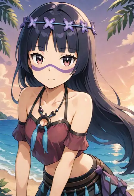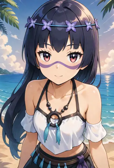 hair ornament, white crop top, detached sleeves, short sleeves, bare shoulders, necklace, belt, print skirt, black skirt, sandals, toes