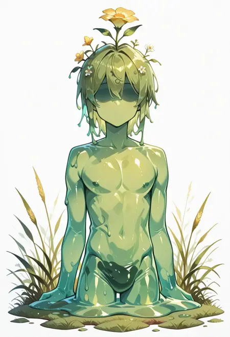 terra slime, slime creature, slime male, transparent body, glowing core, no face, no eyes, no mouth, green skin, colored skin, muscular, abs, pectorals, navel, melting, grass instead of hair, soil head, green grass hair, flowers on hair, nature on head, sunlight, hair over eyes,