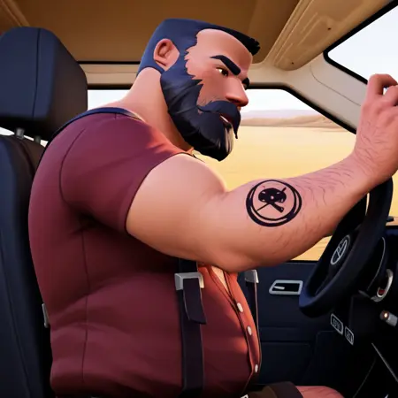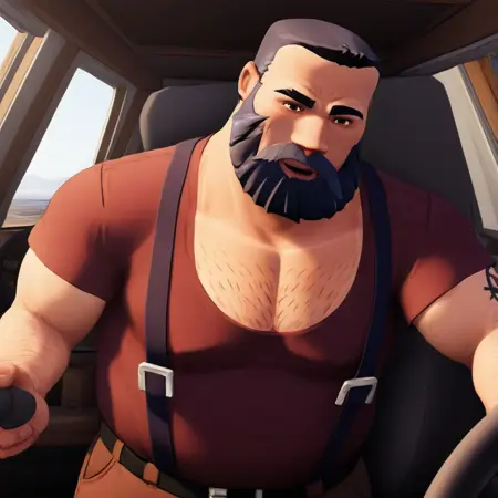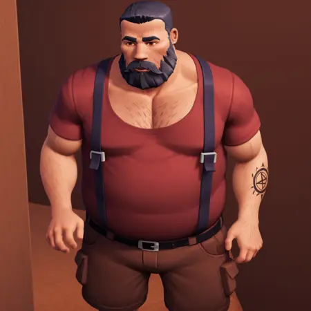 john, solo, male focus, older male, bara, chubby, facial hair, beard, brown eyes, short hair, hairy, arm hair, muscular, red shirt, chest hair, suspenders, mustache, brown shorts, tattoo, belt, short sleeves, thick eyebrows, black hair, brown boots,