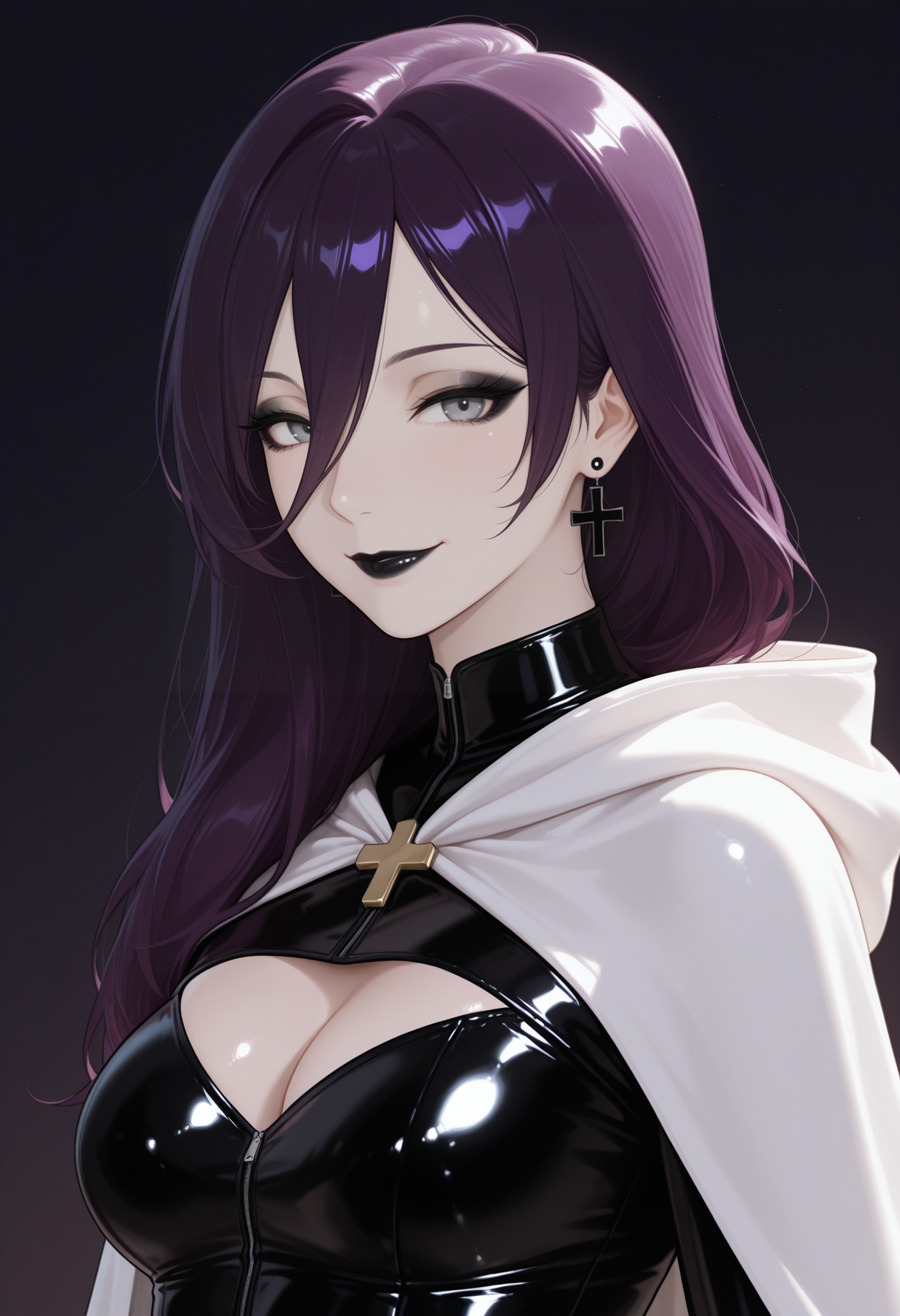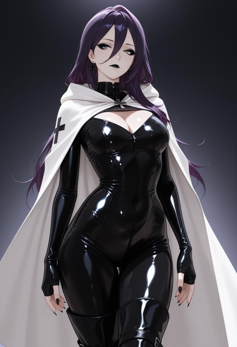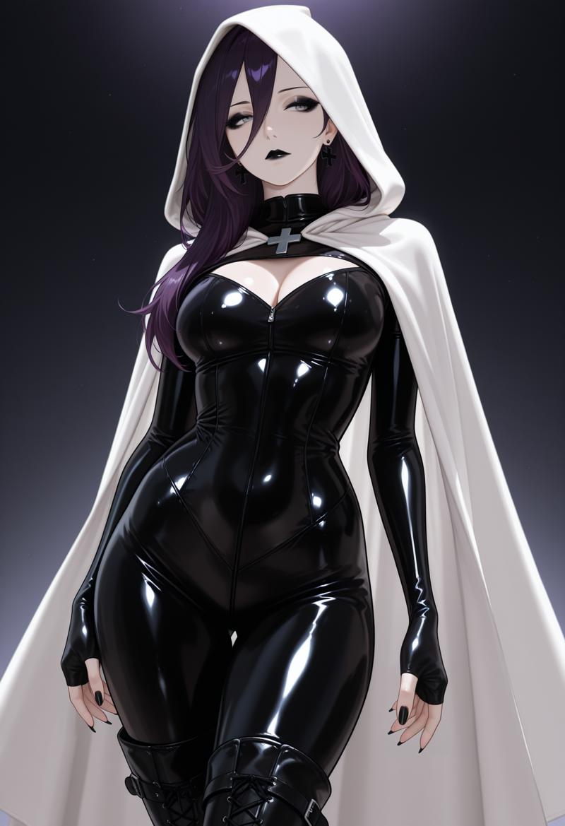 White Cape, Hood Up, Latex Bodysuit, Cleavage cutout, Fingerless Gloves, Thigh Boots, Black Cross Earrings,