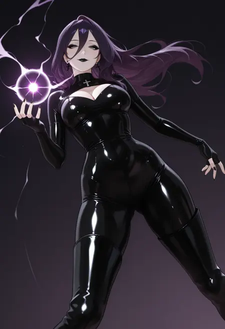 Latex Bodysuit, Cleavage cutout, Fingerless Gloves, Thigh Boots, Black Cross Earrings,
