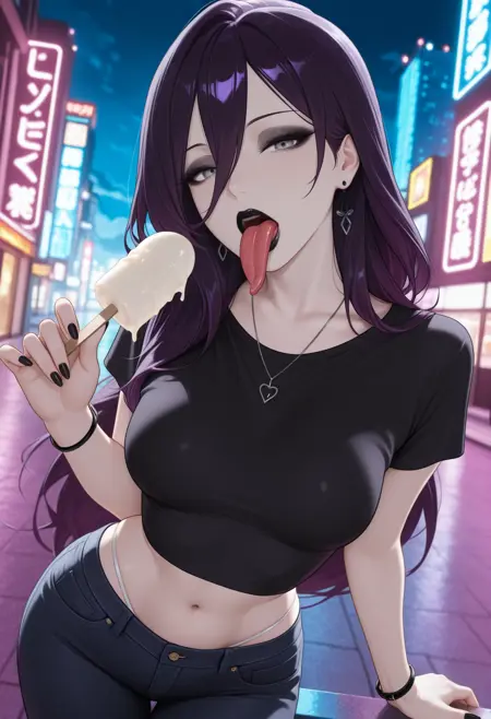 Eve, Mature Woman, Pale Skin, Grey eyes, Black eyeshadow, Black Lipstick, Purple hair, Long hair, Hair in between eyes, Slim body, Medium breasts, Long nails, Black Nails, Naked, Pussy, Pubic Hair,