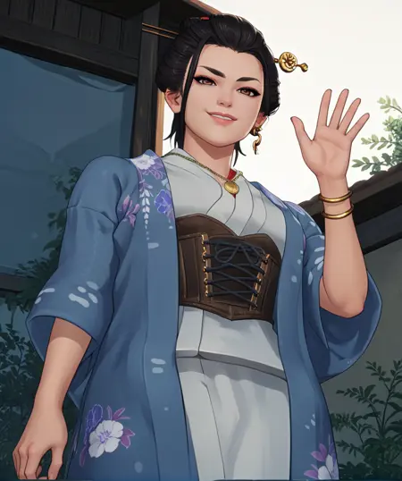 blue layered kimono, necklace, single earring, corset, a gold bracelet,