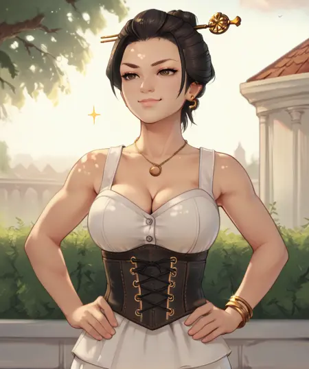 chibaxl, brown eyes, black hair, ponytail, parted bangs, hair stick,