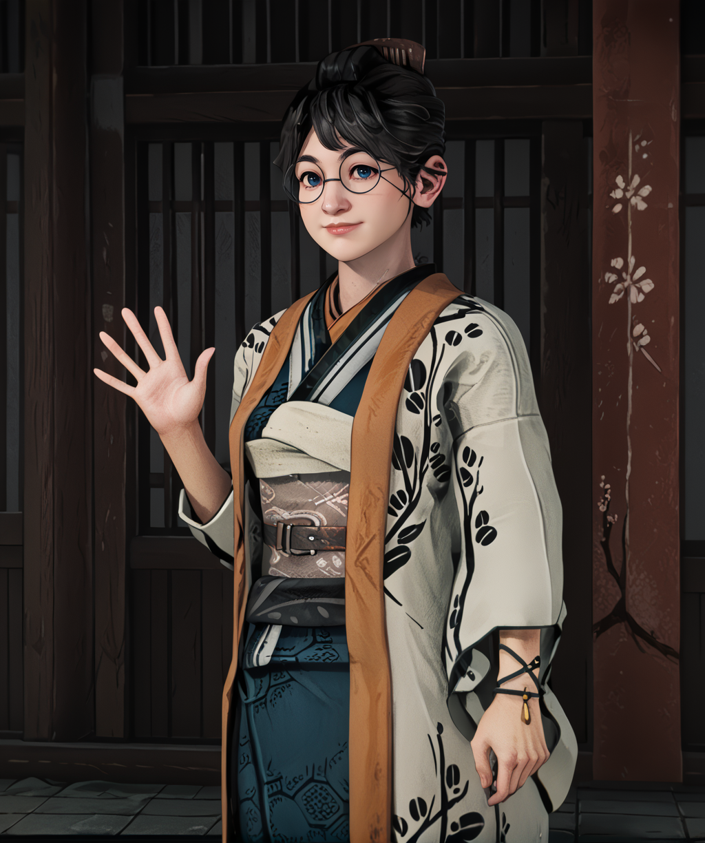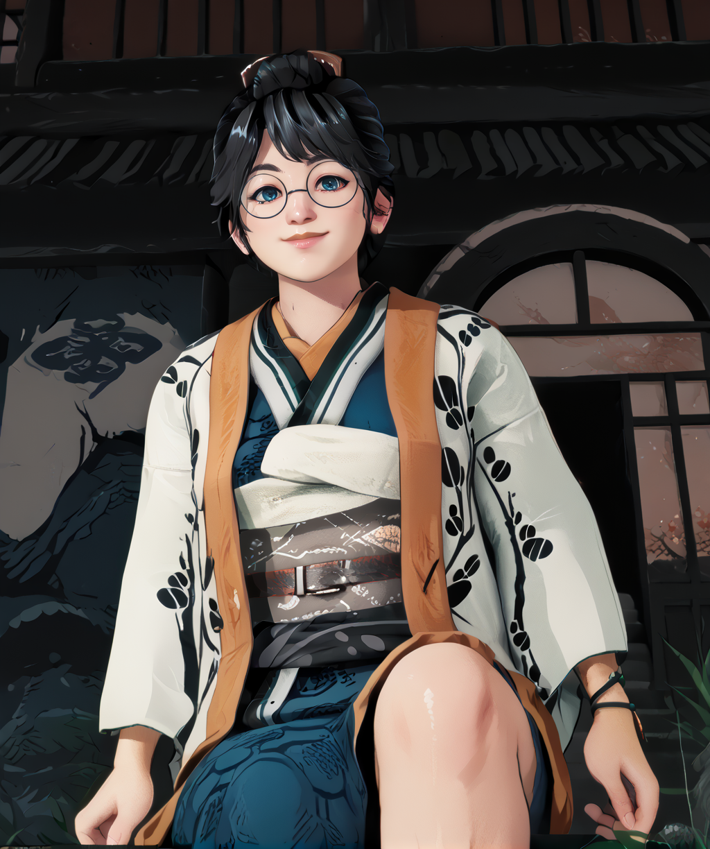 glasses, kimono, coat, single wristband,