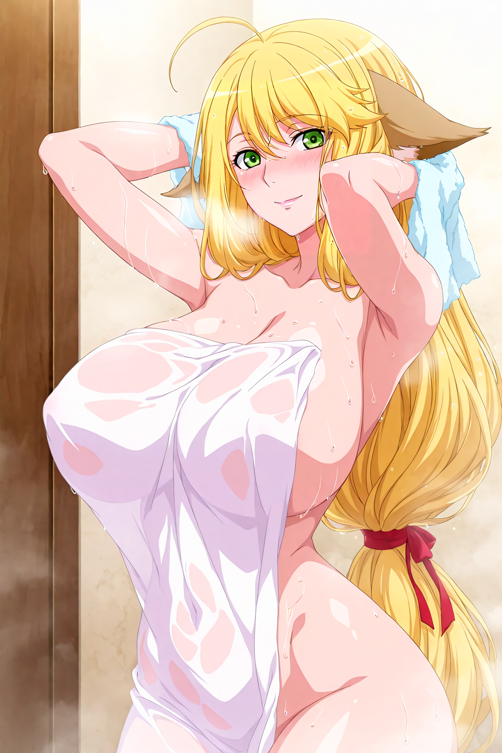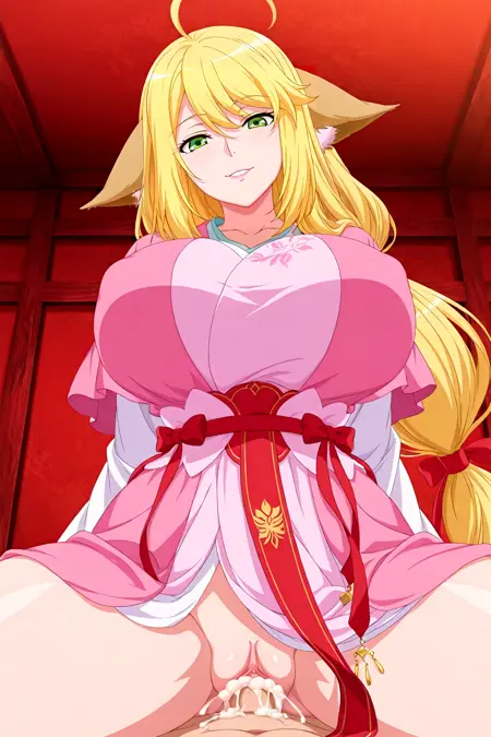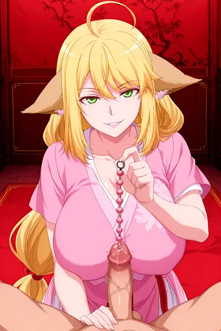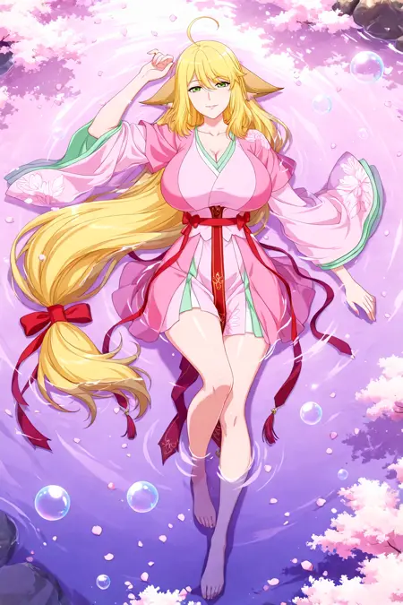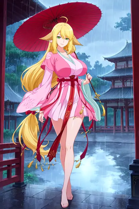 tushan honghong, long hair, low-tied long hair, animal ears, ahoge, blonde hair, green eyes, fox ears, bare foot, chinese clothes, pink hanfu