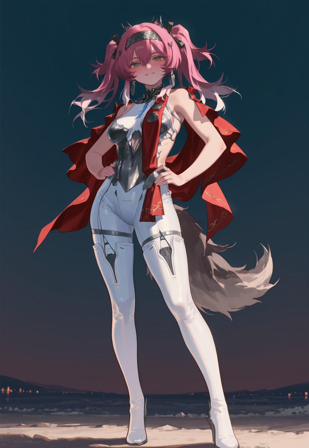 bare shoulders, red cape, sidelocks, hair ribbon, hair ornament, bodysuit, thigh boots,