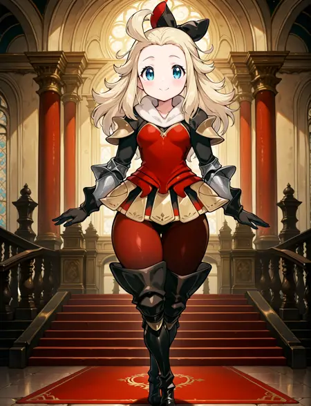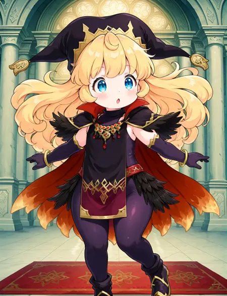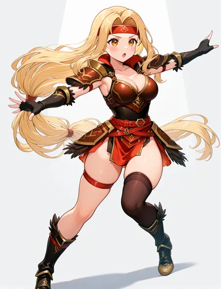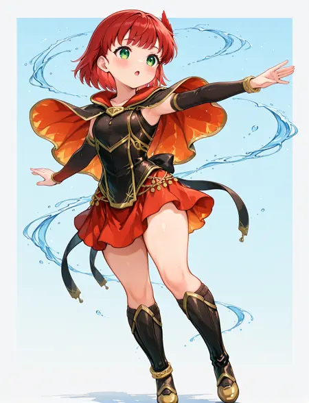 alternate costume, flame print, red and black outfit, feather trim, gold trim,