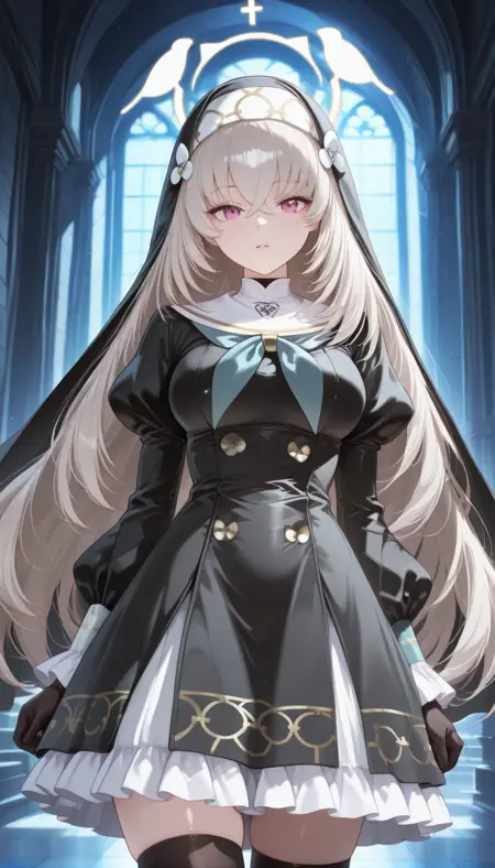 gloves, thighhighs, black gloves, black thighhighs, leotard, groin, covered navel, black headwear, highleg, thigh boots, black leotard, veil, highleg leotard, nun, habit, latex, latex legwear,