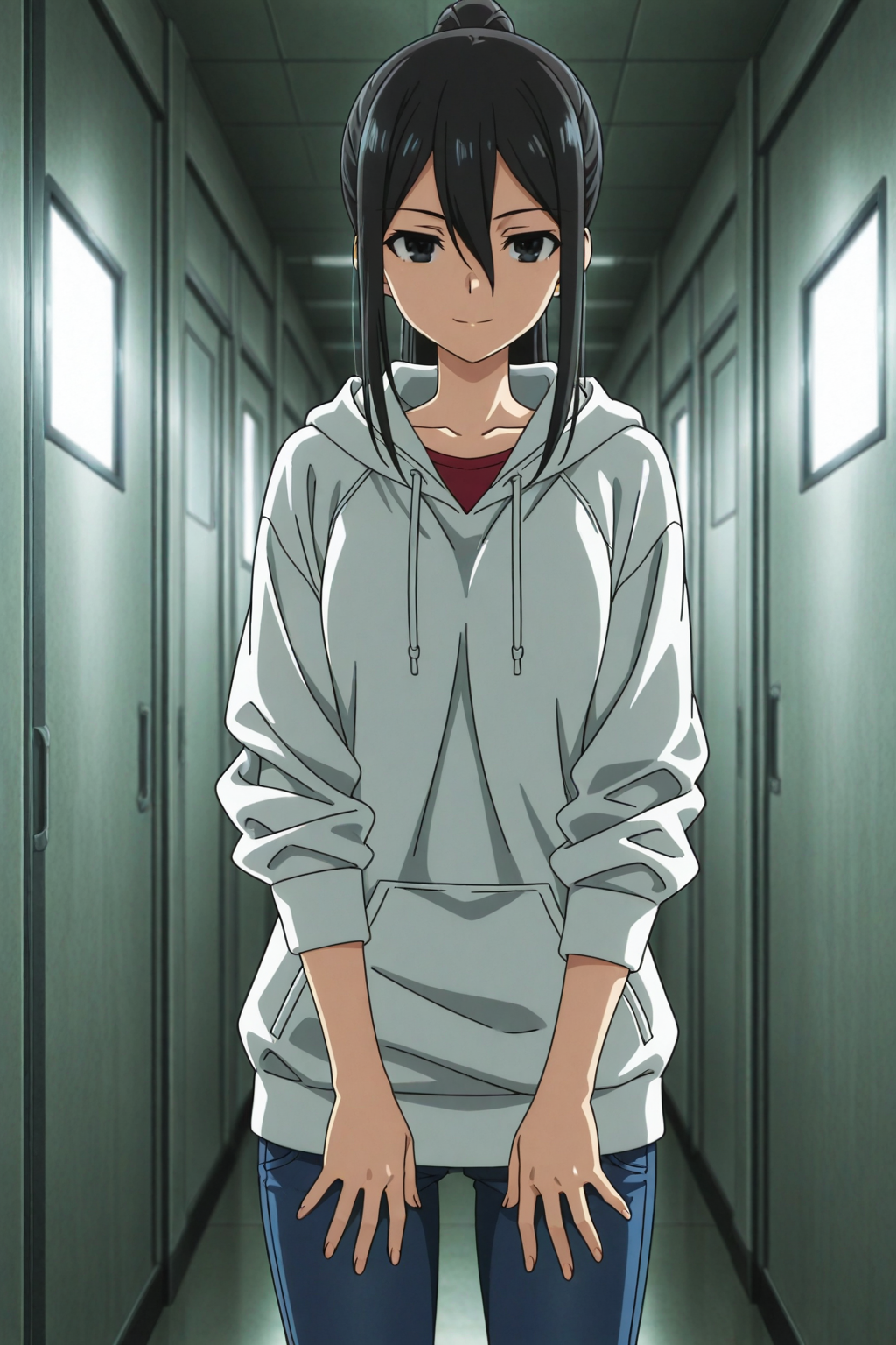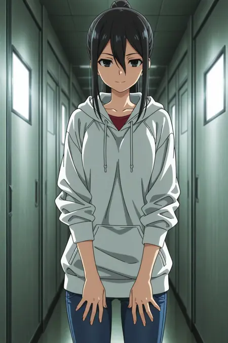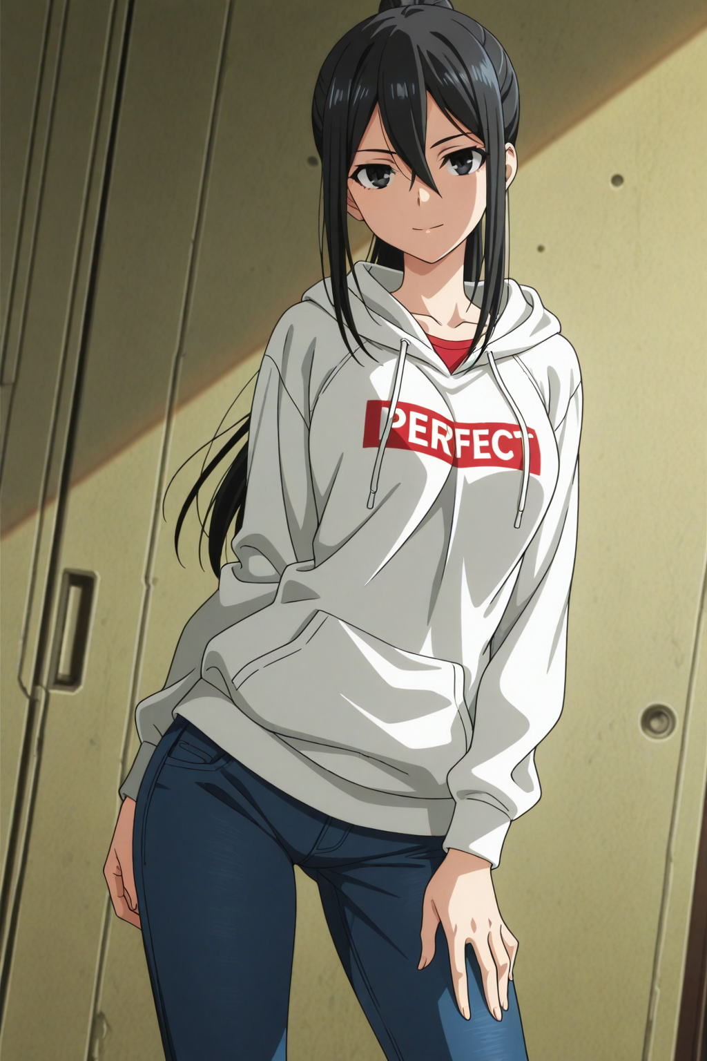appearance: 1girl, black hair, black eyes, ponytail, hair between eyes