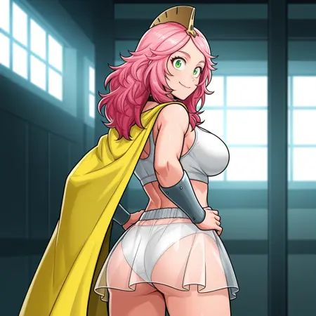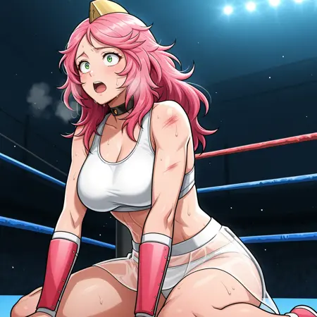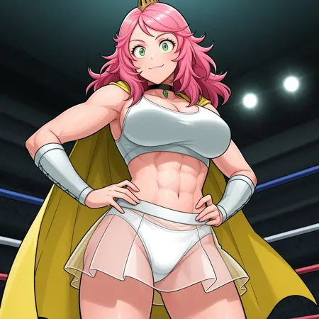 white sports bra, white panties, see-through skirt, skin tight, yellow cape, white arm guards, wrestling outfit, choker,