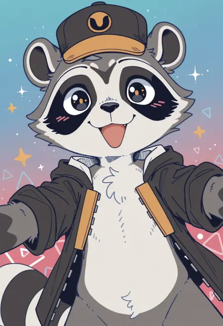 Illustrious: best quality, amazing quality, very aesthetic, absurdres, newest, g4l4ctic_b4seb411er, raccoon, furry, furry male, solo, 1boy, black jacket, hat, ...your tags...