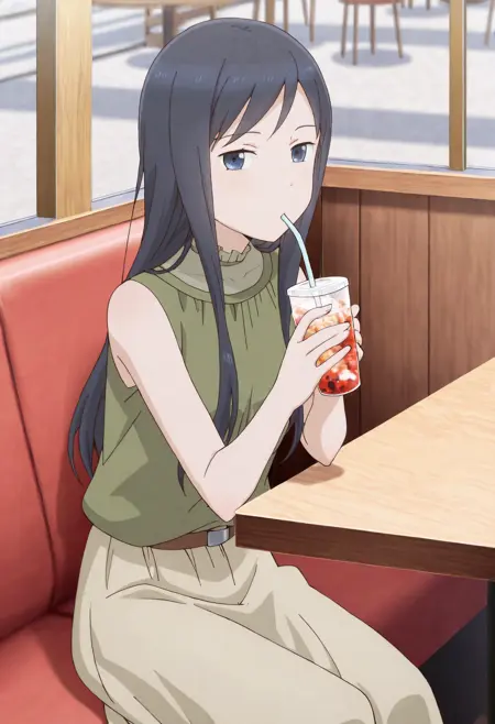 frilled collar, sleeveless blouse, green blouse, khaki skirt. long skirt, belt,