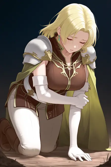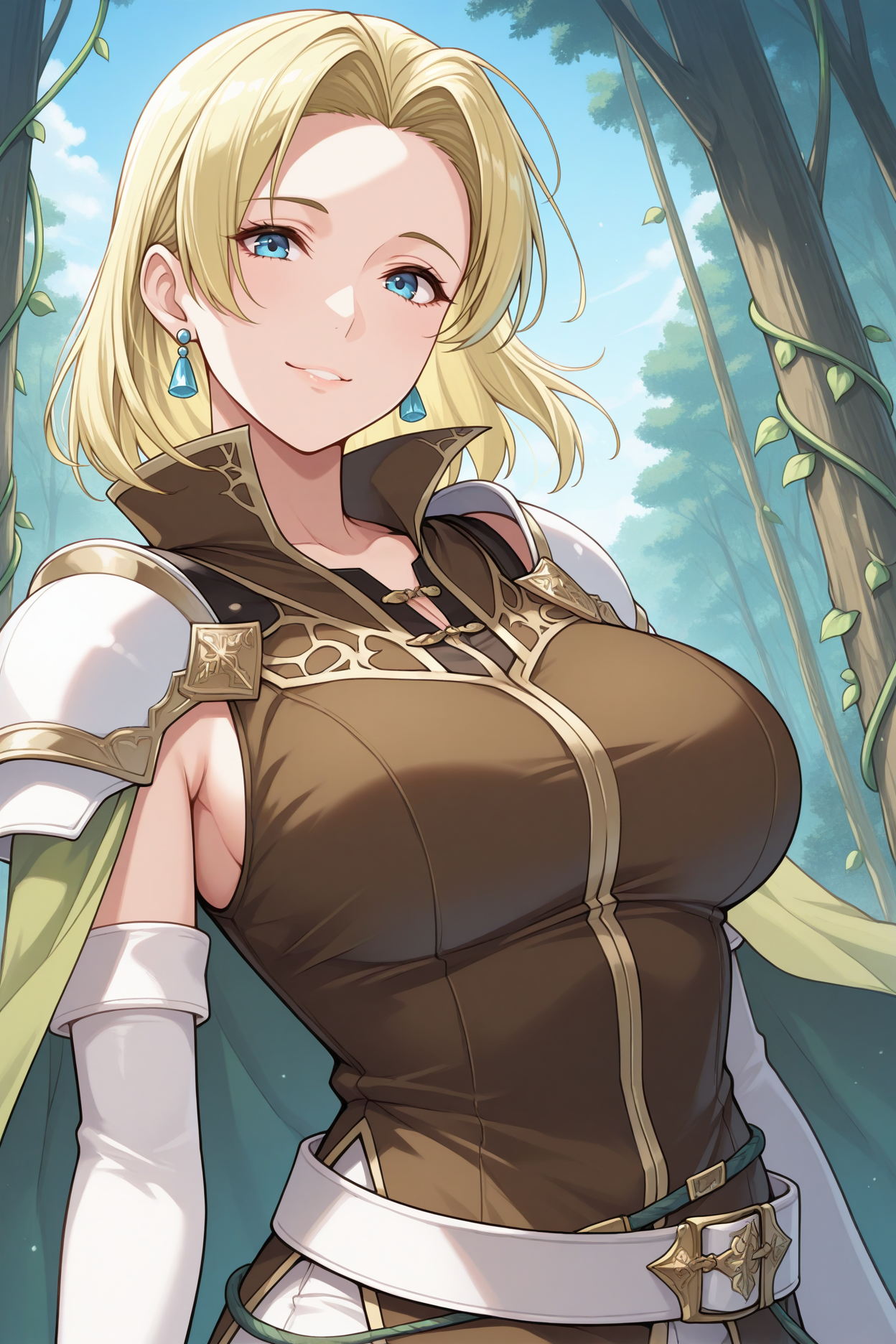 为她的普通外观添加:“defsen, 金色头发, 中长发, 蓝眼睛, 成熟女性, 耳环, 肩甲, 绿色斗篷, 棕色无袖上衣, 无袖, 白色腰带, 肘部手套, 白色手套, 白色长裤, 棕色靴子”。