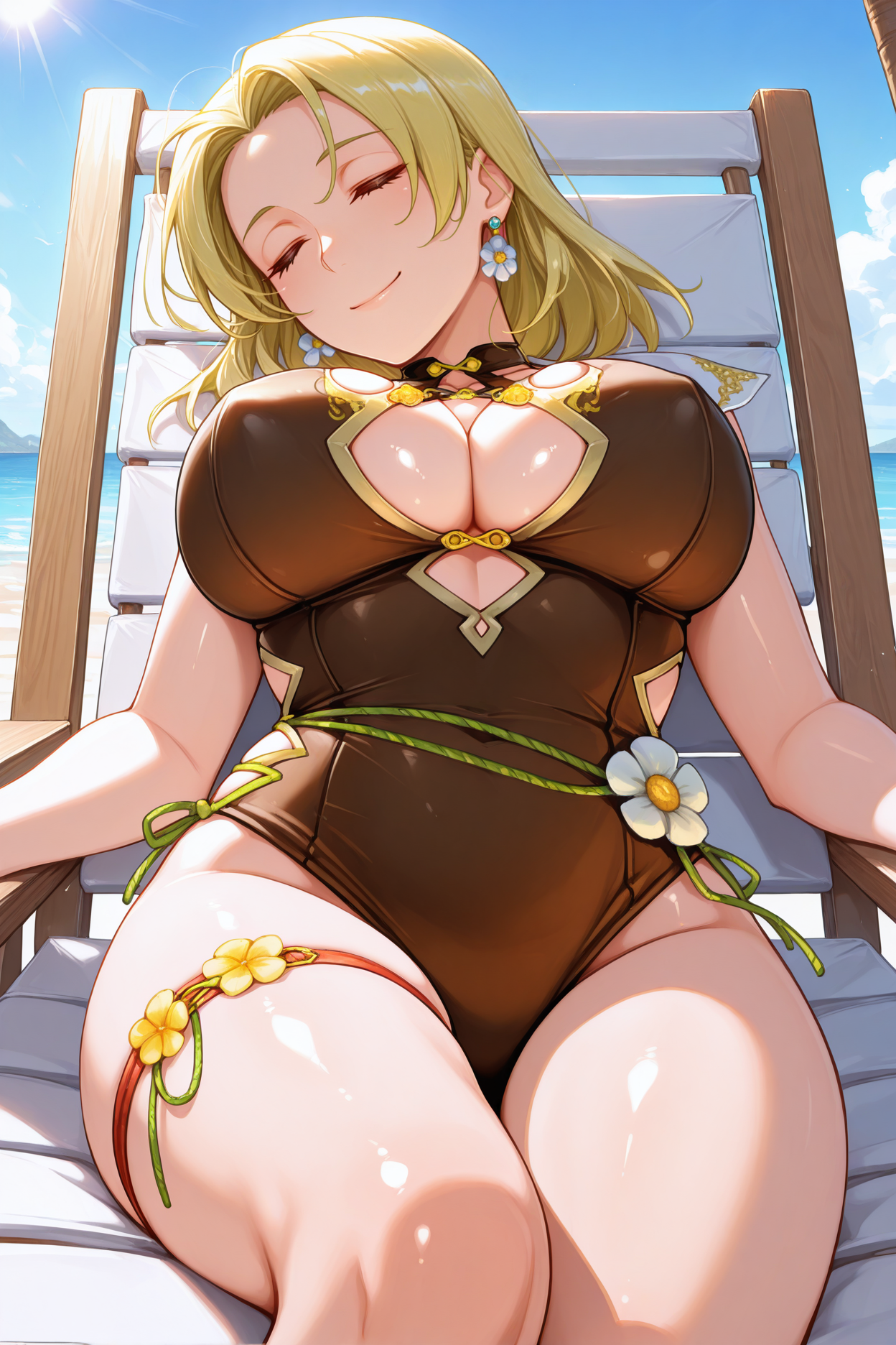 为夏季塞莉娜添加:“sumrsen, 金色头发, 中长发, 蓝眼睛, 成熟女性, 耳环, 棕色连体泳衣, 露胸设计, 大腿绑带, 花朵”。