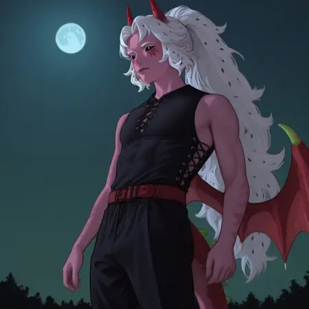 crk, pitayadragoncookie, dragon boy, pink skin, light skin, light pink skin, white hair, black seeds in hair, long hair, black sclera, white slit pupils, white eyelashes, white eyebrows, facepaint, dark pink facepaint, red horns, gradient horns, green gradient on horns, scales, scales on skin, dragon wings, wings, red wings, gradient wings, green gradient on wings, tail, spiky tail, red tail, gradient tail, green gradient on tail, dragon claws, claws, dragon feet, talons, green tongue, sharp teeth, pointy teeth,