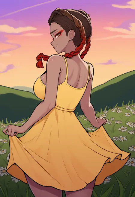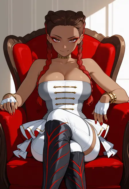 외모: 검은 피부를 가진 여자, 긴 머리, 다색 머리, 그라데이션 머리, 갈색 머리, 빨간 머리, 귀 뒤 머리, 쌍뜨개, 갈색 눈, 빨간 아이섀도우, 큰 가슴
