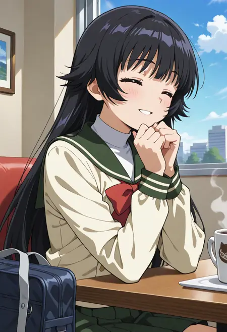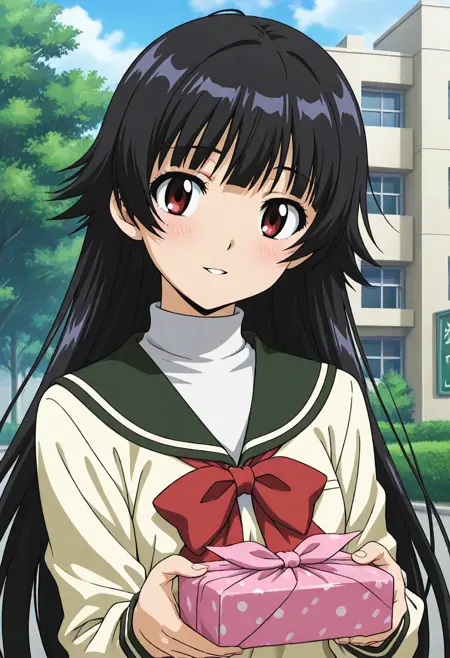 Outfit (school uniform): yuuri_uniform, school uniform, serafuku, green pleated skirt, red bowtie, sailor collar, white turtleneck shirt